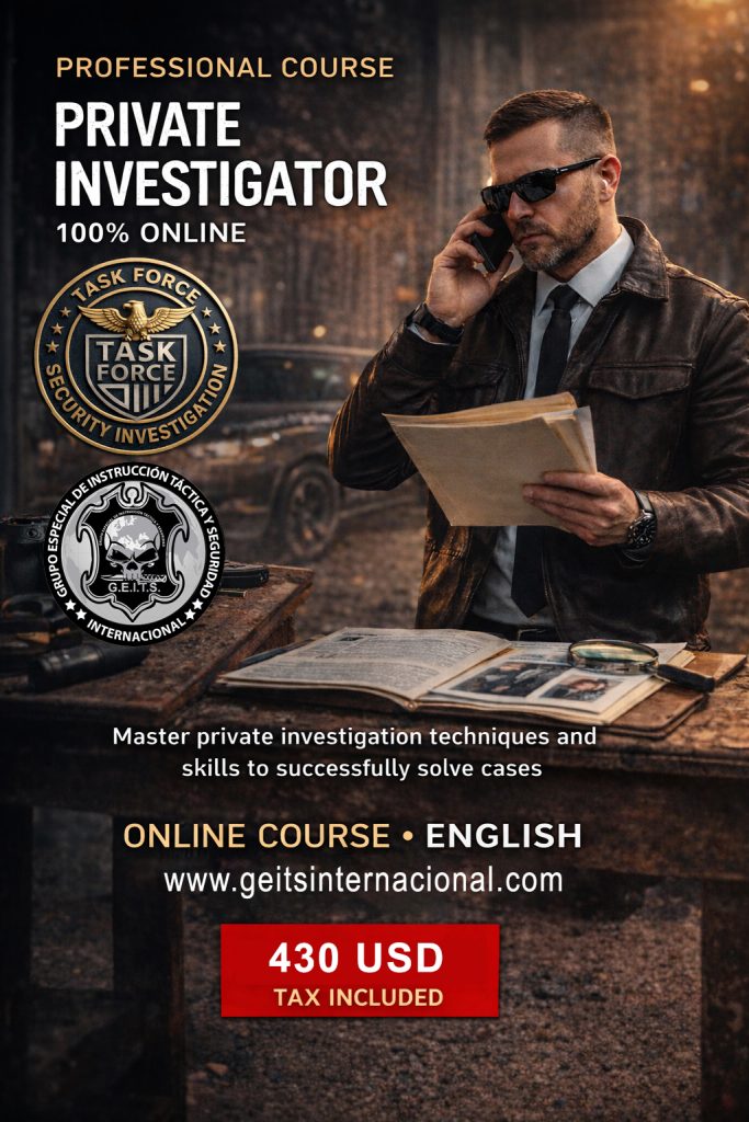 This course provides specialized online training in Private Investigation, aimed at understanding the international legal framework, professional investigation procedures, and good operational practices applicable to the work of a private investigator in different environments and jurisdictions.