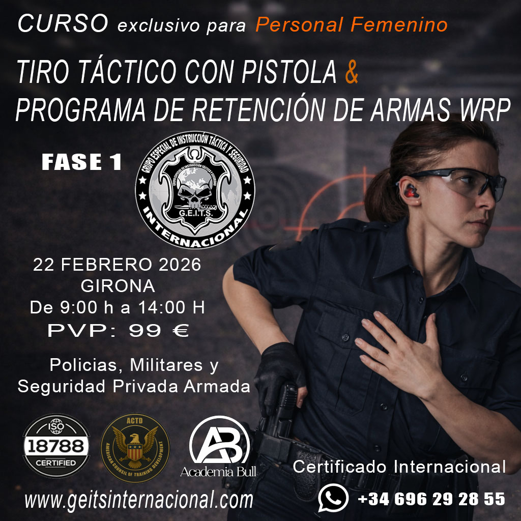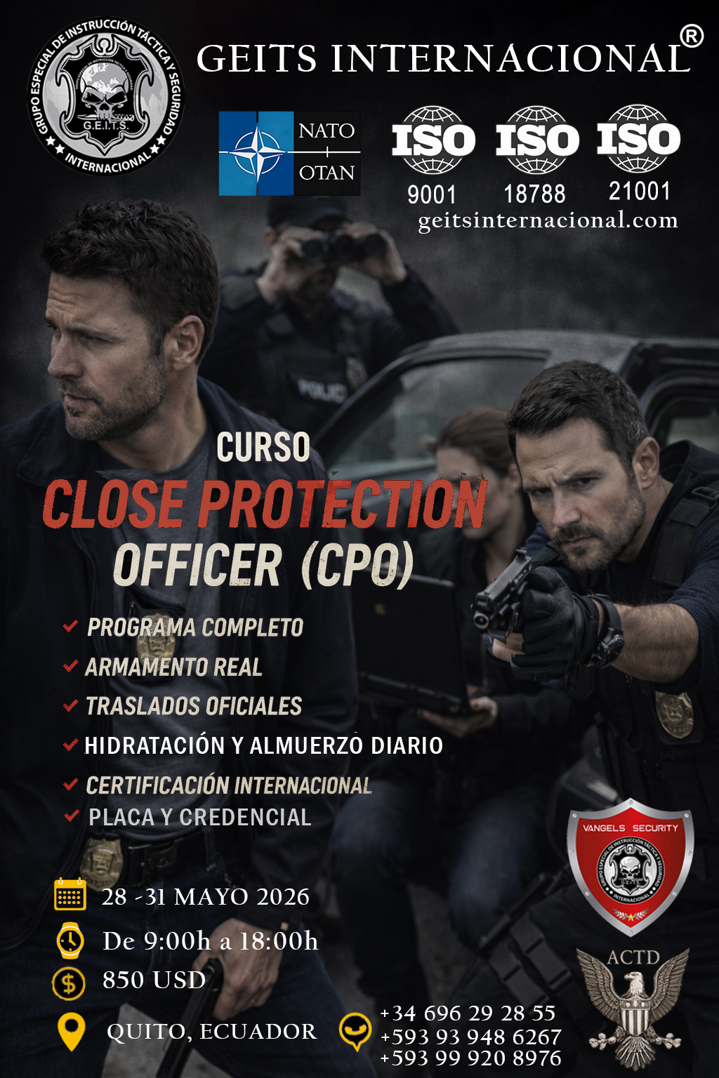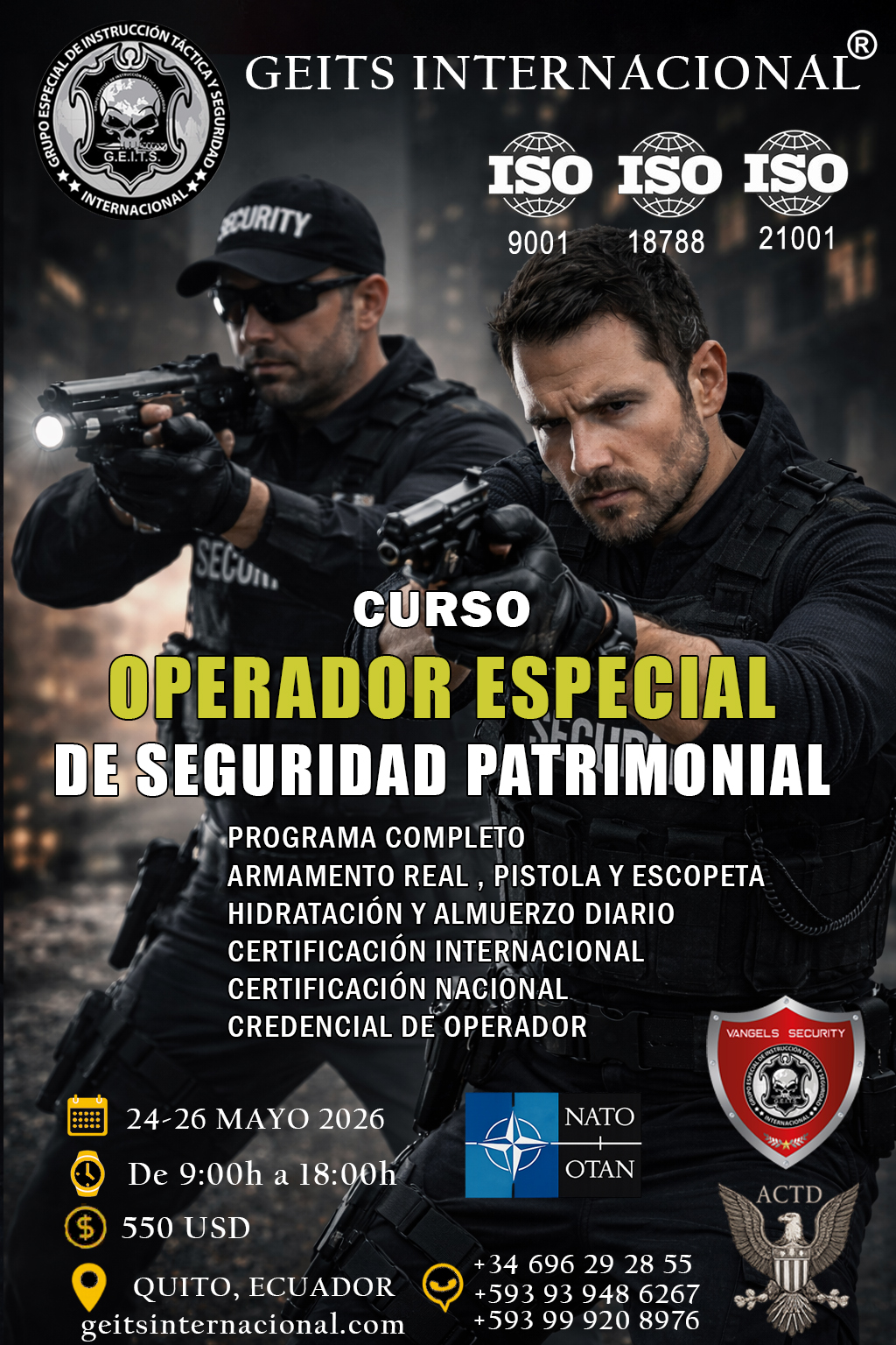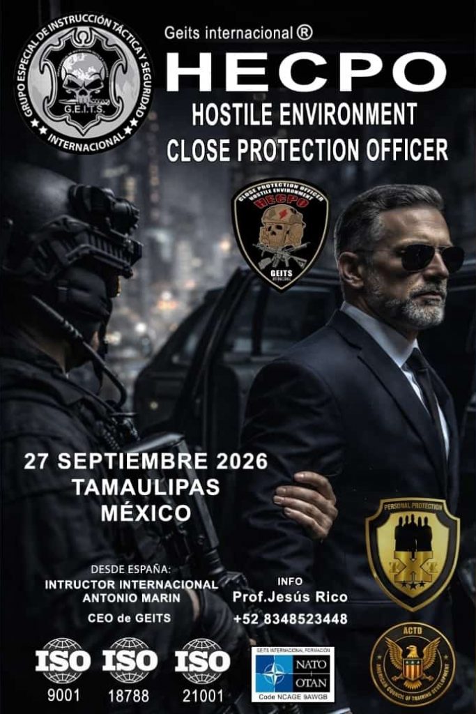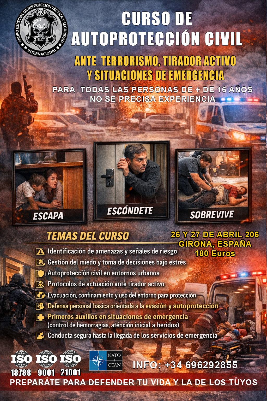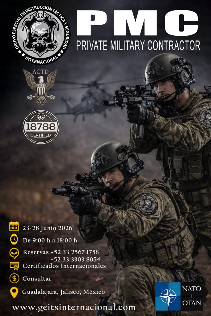 CALENDARIO 2026 Febrero de 2026 Tiro Táctico con Pistola & Programa de Retención de armas WRP – Personal Femenino. 1 día 22 de febreroLugar: Girona España Información Personal Security Detail – PSD 5 días 17 de febrero – 21 de febreroLugar: Girona España Información Abril de 2026 Curso de Autoprotección Civil ante Tirador Activo y Evento Terrorista 2 días 26 de abril – 27 de abrilLugar: Girona España Información Mayo de 2026 Curso Especial de Seguridad Patrimonial 3 días 24 de mayo – 26 de mayoLugar: Quito, Ecuador Información Close Protection Office – CPO 4 días 28 de mayo – 31 de mayoLugar: Quito, Ecuador Información Junio de 2026 Military & Security Martial Arts Combat Program – MSMACPCadete Grey Belt Level 1 2 días 19 de junio – 20 de junioLugar: Guadalajara, Jalisco, México Información Private Military Contractor – PMC 6 días 23 de junio – 28 de junioLugar: Guadalajara, Jalisco, México Información Septiembre de 2026 Combate Urbano Policial – CQB – VCQB – WRP 1 día 26 de septiembreLugar: Tamaulipas, México Información Hostile Environment Close Protection Officer – HECPO 1 día 27 de septiembreLugar: Tamaulipas, México Información CALENDARIO 2026 Febrero de 2026 Tiro Táctico con Pistola & Programa de Retención de armas WRP – Personal Femenino. 22 de febrero Lugar: Girona, España Información Personal Security Detail – PSD 17 de febrero – 21 de febrero Lugar: Girona, España Información Abril de 2026 Curso de Autoprotección Civil ante Tirador Activo y Evento Terrorista 26 de abril – 27 de abril Lugar: Girona, España Información Mayo de 2026 Operador Especial de Seguridad Patrimonial 24 de mayo – 26 de mayo Lugar: Quito, Ecuador Información Close Protection Officer – CPO 28 de mayo – 31 de mayo Lugar: Quito, Ecuador Información Junio de 2026 Military & Security Martial Arts Combat Program – MSMACPCadete Grey Belt Level 1 19 – 20 de junio Lugar: Gudalajara, Jalisco, México Información Private Military Contractor – PMC 23 – 28 de junio Lugar: Gudalajara, Jalisco, México Información Septiembre de 2026 Combato Urbano Policial – CQB – VCQB – WRP 26 de septiembre Lugar: Tamaulipas, México Información Hostile Environment Close Protection Officer – HECPO 27 de septiembre Lugar: Tamaulipas, México Información