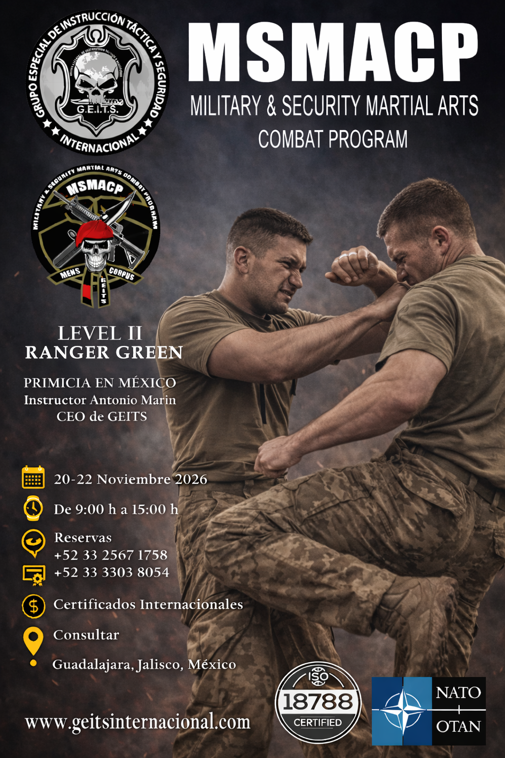 CALENDARIO 2026 Febrero de 2026 Tiro Táctico con Pistola & Programa de Retención de armas WRP – Personal Femenino. 1 día 22 de febreroLugar: Girona España Información Personal Security Detail – PSD 5 días 17 de febrero – 21 de febreroLugar: Girona España Información Abril de 2026 Curso de Autoprotección Civil ante Tirador Activo y Evento Terrorista 2 días 26 de abril – 27 de abrilLugar: Girona España Información Mayo de 2026 Curso Especial de Seguridad Patrimonial 3 días 24 de mayo – 26 de mayoLugar: Quito, Ecuador Información Close Protection Office – CPO 4 días 28 de mayo – 31 de mayoLugar: Quito, Ecuador Información Junio de 2026 Military & Security Martial Arts Combat Program – MSMACPCadete Grey Belt Level 1 2 días 19 de junio – 20 de junioLugar: Guadalajara, Jalisco, México Información Private Military Contractor – PMC 6 días 23 de junio – 28 de junioLugar: Guadalajara, Jalisco, México Información Septiembre de 2026 Combate Urbano Policial – CQB – VCQB – WRP 1 día 26 de septiembreLugar: Tamaulipas, México Información Hostile Environment Close Protection Officer – HECPO 1 día 27 de septiembreLugar: Tamaulipas, México Información Abril de 2026 MSMACP Lelvel II Ranger Green 3 días 20 de noviembre – 22 de noviembreLugar: Guadalajara, Jalisco, México Información CALENDARIO 2026 Febrero de 2026 Tiro Táctico con Pistola & Programa de Retención de armas WRP – Personal Femenino. 22 de febrero Lugar: Girona, España Información Personal Security Detail – PSD 17 de febrero – 21 de febrero Lugar: Girona, España Información Abril de 2026 Curso de Autoprotección Civil ante Tirador Activo y Evento Terrorista 26 de abril – 27 de abril Lugar: Girona, España Información Mayo de 2026 Operador Especial de Seguridad Patrimonial 24 de mayo – 26 de mayo Lugar: Quito, Ecuador Información Close Protection Officer – CPO 28 de mayo – 31 de mayo Lugar: Quito, Ecuador Información Junio de 2026 Military & Security Martial Arts Combat Program – MSMACPCadete Grey Belt Level 1 19 – 20 de junio Lugar: Gudalajara, Jalisco, México Información Private Military Contractor – PMC 23 – 28 de junio Lugar: Gudalajara, Jalisco, México Información Septiembre de 2026 Combato Urbano Policial – CQB – VCQB – WRP 26 de septiembre Lugar: Tamaulipas, México Información Hostile Environment Close Protection Officer – HECPO 27 de septiembre Lugar: Tamaulipas, México Información Noviembre de 2026 MSMACP Level II Ranger Green 20 de noviembre Lugar: Guadalajara, Jalisco, México Información